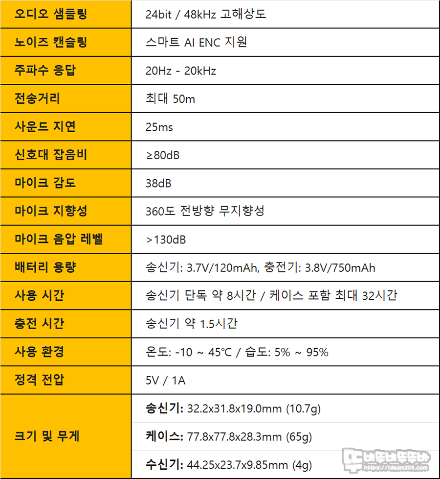 TX (Transmit) : 데이터를 보내는 쪽 (송신) 1개, Type-C 방식, RX (Receive) : 데이터를 받는 쪽 (수신) 2개 구성, 48kHz / 24bit 고해상도 음성 녹음, 스마트 AI ENC 노이즈 캔슬링 지원, 360도 전방향 무지향성, 사용 시간 송신기 단독 약 8시간 / 케이스 포함 최대 32시간, 충전 시간 송신기 약 1.5시간 등의 정보를 확인할 수 있습니다.