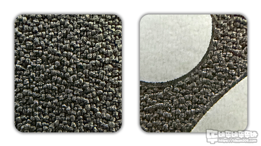 대체적으로 모직의 짜임이 왼쪽에서 오른쪽으로 향하는 부분을 확인할 수 있지만, 마우스를 X, Y 방향 또는 원으로 움직일 때 가로방향의 결을 역행하는 움직임에 저항감이 없어 게임을 하는데 불편함이 없습니다.