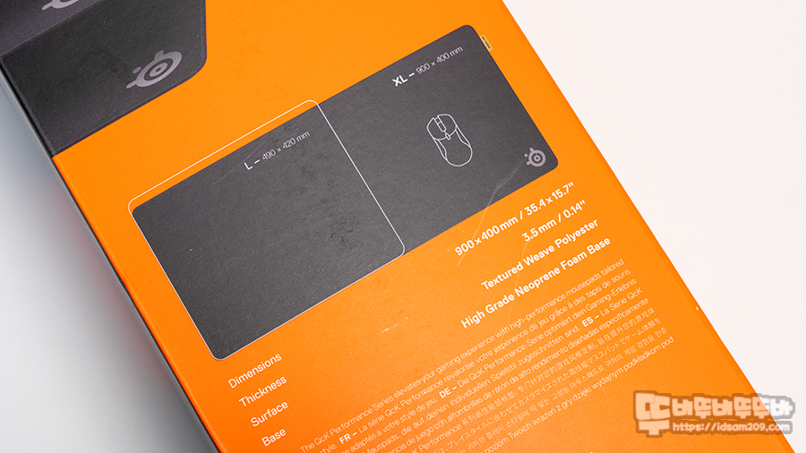 표면 : 폴리에스터 블렌드, 베이스 : 네오프렌 폼 베이스, 크기 : 900 x 400mm, 두께 : 3.5 mm 등의 정보를 확인할 수 있네요.