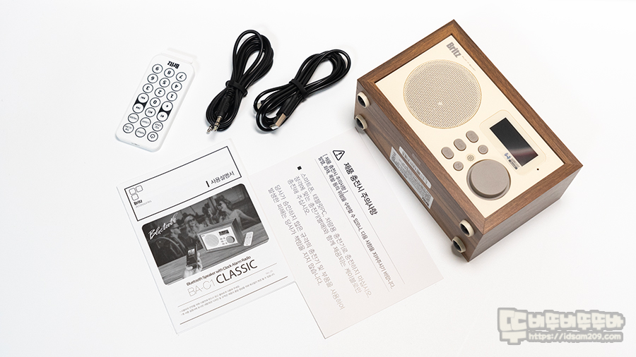 제품은 BA-C1 Classic 본체, 3.5mm AUX 케이블, USB-C to A 충전 케이블, 리모컨, 사용 설명서로 알차게 구성되어 있습니다.