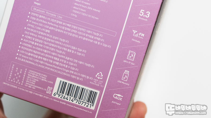 블루투스 5.3, 4W 출력 (57mm 드라이버), 입력 모드(FM 라디오/MicroSD/USB MP3 Play/시계/듀얼 알람/AUX 입력), 1,800mAh 배터리 내장(충전 약 5시간, 50% 볼륨/ 약 8시간 재생), MDF 인클로저, 리모컨 지원, EQ사운드 지원, 크기 155 X 73 X 101mm, 무게 600g 등의 정보를 확인할 수 있습니다.