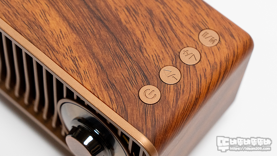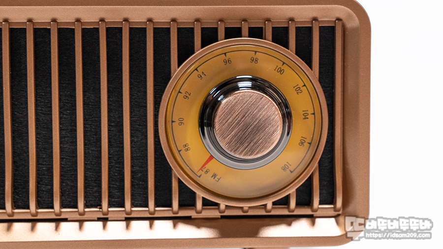 스피커 전면에 그릴 부분과 FM 노브는 오래된 전축 느낌으로 앤티크 느낌을 잘 살려 중후한 느낌과 아날로그 느낌을 잘 살려주었습니다.