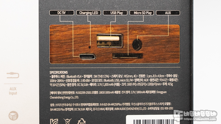 블루투스 버전 5.3, 5W 출력, 52mm 드라이버 유닛, 8.9 X 4.9mm 패시브 라디에이터, 입력 모드 (블루투스, USB, MicroSD, FM 라디오, AUX입력), LED 무드램프, 베이스 리플렉트 시스템, 우드 스타일 인클로저 디자인, 배터리 용량 1,800mAh, 충전시간 약 4시간, 사용시간 약 10시간(볼륨 50%) 등의 정보를 확인할 수 있습니다.