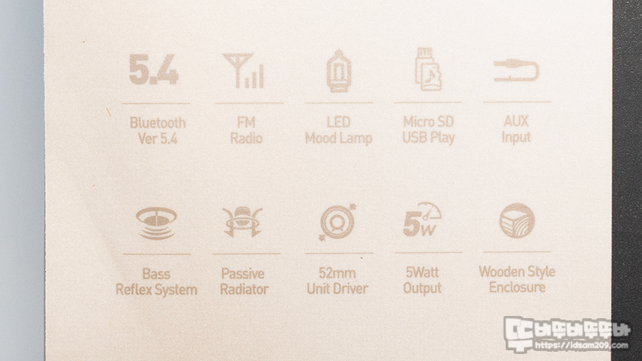 측면에는 포인트 정보로 블루투스 5.4, FM 라디오, LED 무드램프, MicroSD/USB MP3 Play, AUX 입력, 베이스 리플렉트 시스템, 패시브 라디에이터, 52mm 드라이브, 5W 출력, 우드 스타일 인클로저 등의 정보를 확인할 수 있습니다.