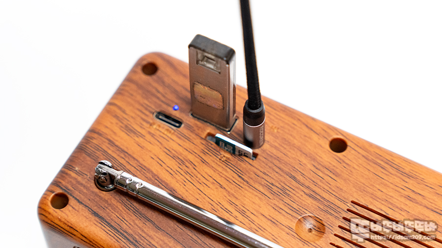 제품 뒷면에는 FM 라디오의 필수인 4단으로 전개되며 전체 길이는 약 345mm 접이식 텔레스코픽 안테나 그리고 USB-A/TF Card 메모리 단자, AUX in 외부 입력 단자 그리고 오른쪽에 미세하게 틈을 보이는 패시브 라디에이터 모습을 확인할 수 있네요.