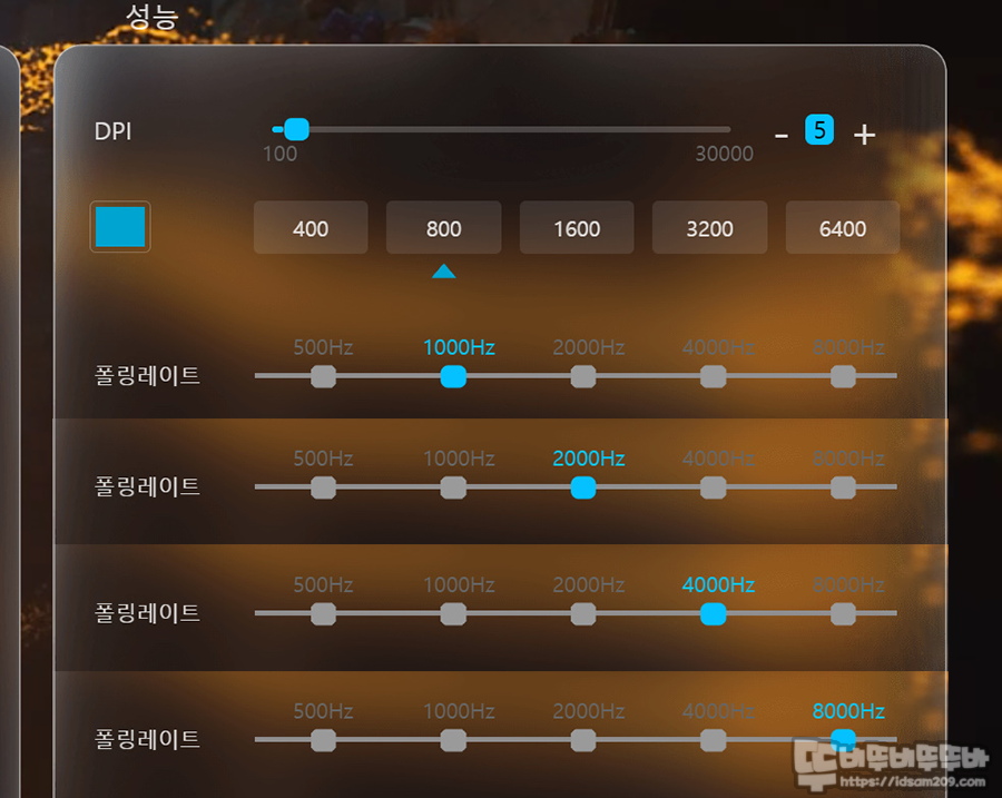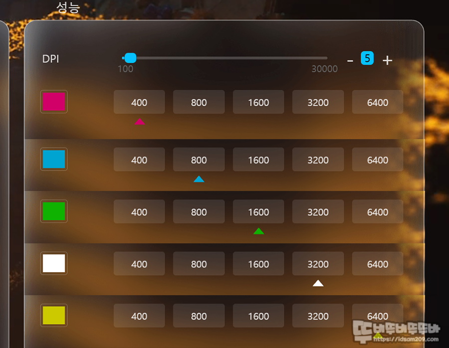 마지막 오른쪽 메뉴는 기본 5단계 DPI 설정과 LED 라이팅 정보를 확인할 수 있으며, DPI는 100 ~ 30,000까지 지원합니다.