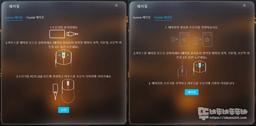 아우라 동글과 크리스탈 동글의 페어링 방식이 다르기에 화면의 내용을 참고하셔서 작업해 주셔야 하니 참고하시기 바랍니다.