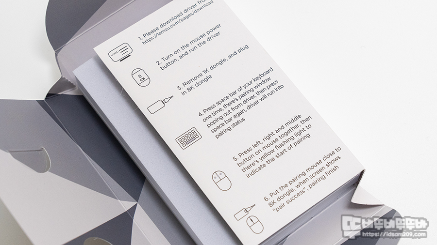 양쪽으로 펼쳐지는 패키지는 왼쪽에 구성품과 오른쪽의 마우스 1K 동글이 안정적으로 포장되어 있습니다.