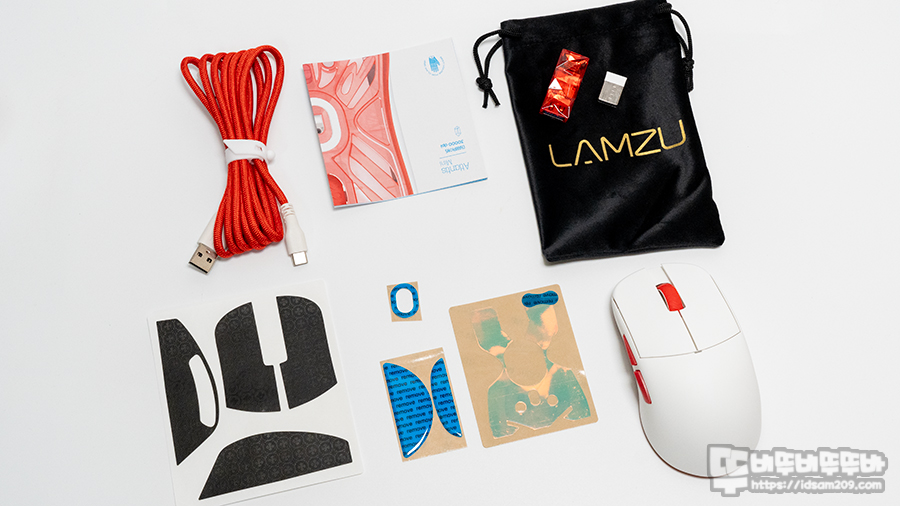 제품은 람주 아틀란티스 미니 챔피언, 크리스탈 어댑터, 1K 리시버, 1.8m 타입 C 케이블, 벨벳 파우치, 먼지 방지 스티커, anti-Slip 그립 테이프, 마우스 피트로 구성되어 있습니다.