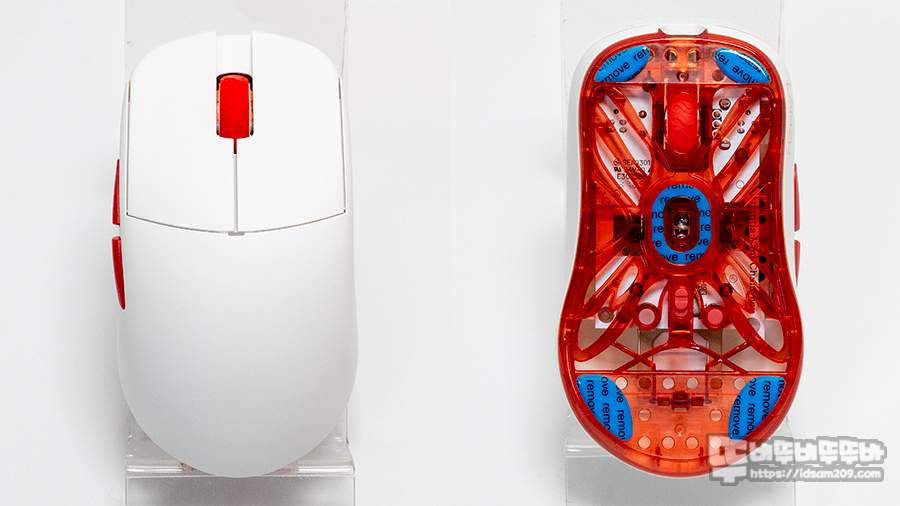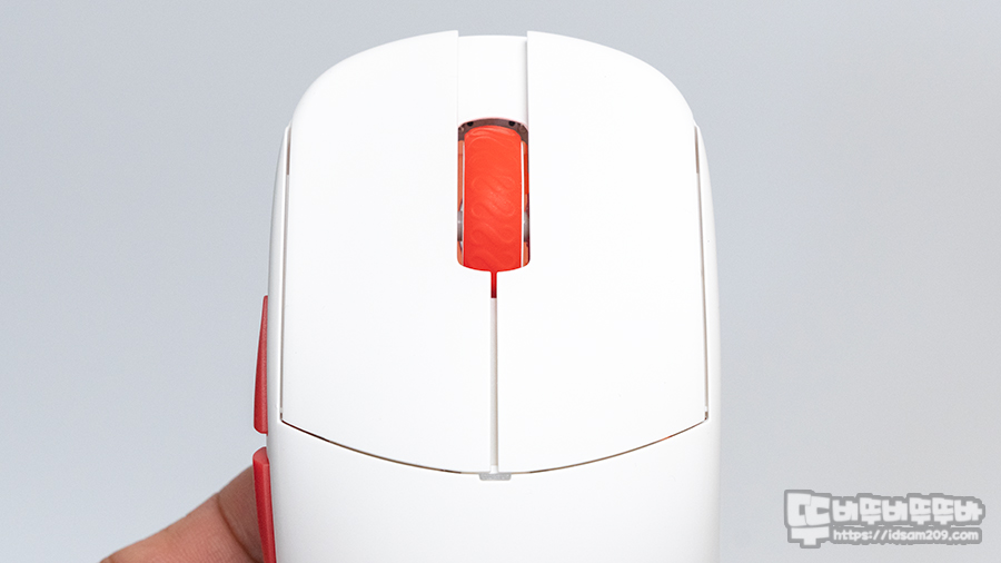 117mm 길이의 대칭형 미니 사이즈 디자인으로 UV 코팅으로 매끄러운 화이트 컬러 상판 하우징과 투명 레드 컬러 하판 하우징 구성과 레드 컬러 휠 고무와 사이드 버튼 구성으로 화이트와 레드 컬러 조합이 상당히 매력적입니다.