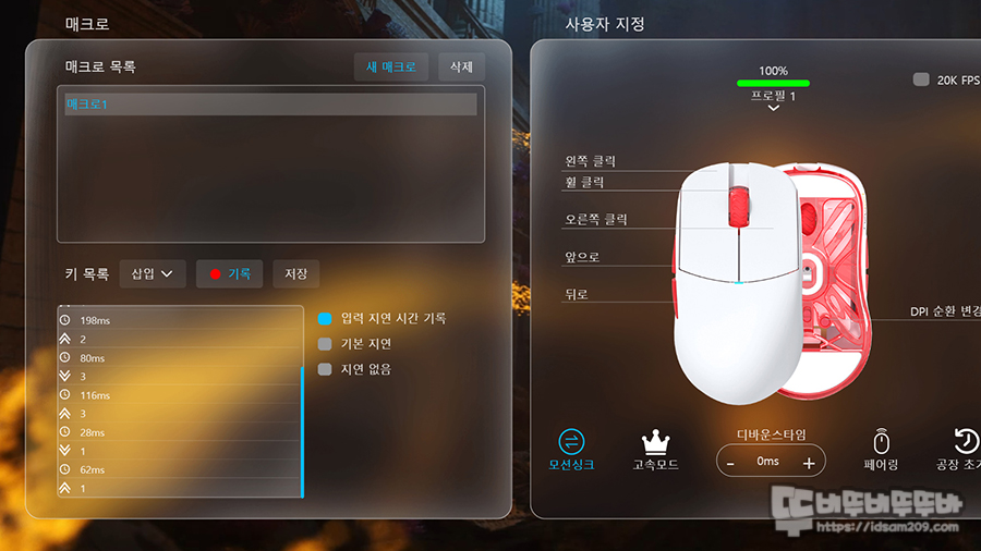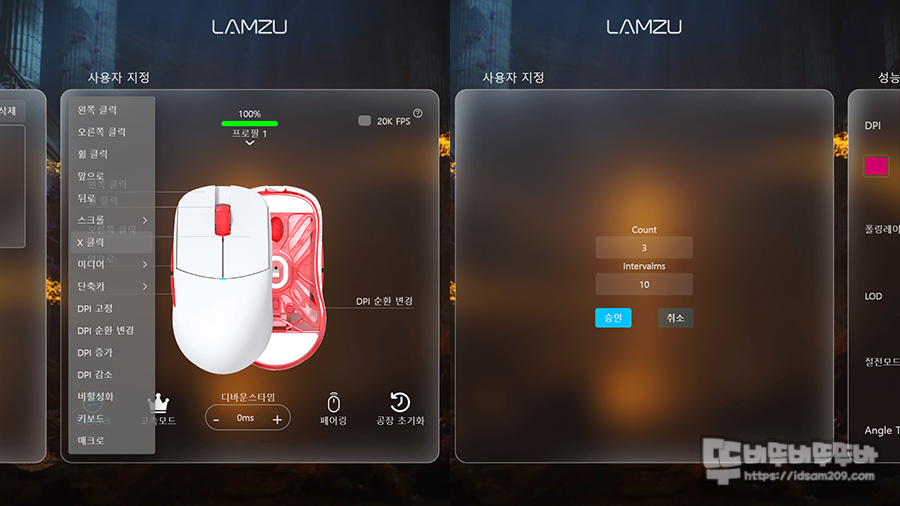 버튼 기능 중 X 클릭 기능을 선택 시 한번 눌렀을 때 눌리는 횟수와 인터벌 설정으로 속사 클릭이 가능하니 참고하시면 좋고요.
