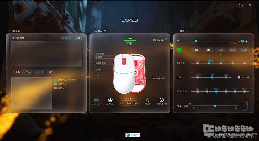 메뉴 구성은 왼쪽의 매크로 메뉴, 중앙에 버튼 기능과 다양한 옵션, 오른쪽에는 DPI 및 폴링 레이트 등 마우스의 모든 기능을 심플하게 표현하고 있네요.
