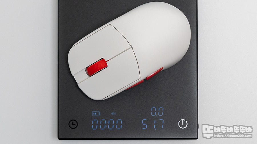 스펙상 51g ± 2g으로 표시되어 있는데, 0.1g 단위로 측정 가능한 디지털 저울로 측정 시 약 51.7g 무게를 확인할 수 있네요.