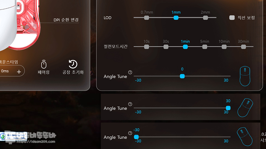그 외로는 0.7mm, 1mm, 2mm LOD 조절과 직선 보정, 그리고 절전모드 시간, 앵글 스냅 조절을 지원을 확인할 수 있습니다.