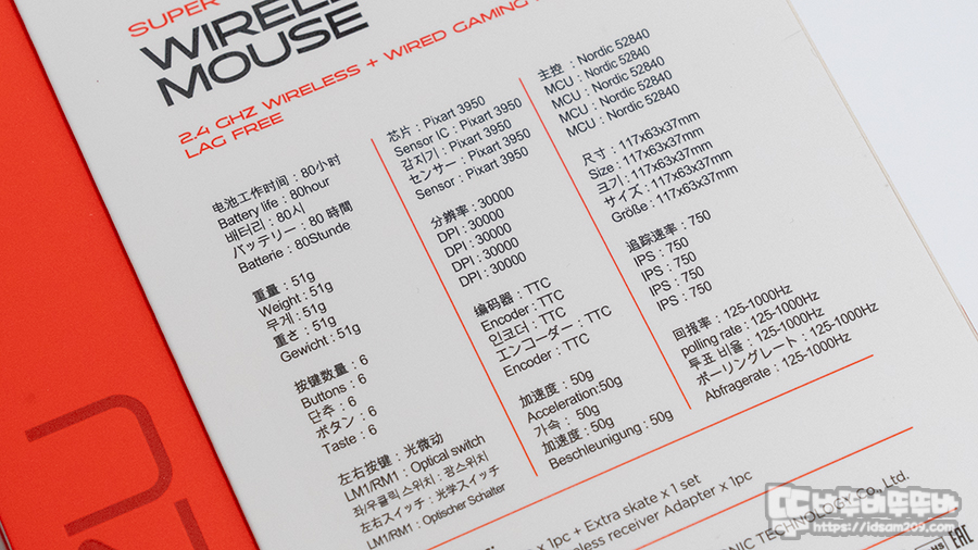 센서: Pixart PAW3950 / 스위치: OMRON 광 스위치 / 인코더: TTC GOLD / MCU: Nordic 52840 / DPI: 최대 30000 dpi / 폴링 레이트: 8K 지원 [기본 : 1K], 유무선 연결 지원 / 사이즈: 117 x 63 x 37mm, 무게: 51g 등의 정보를 확인할 수 있습니다.