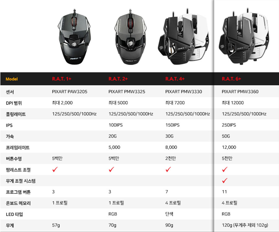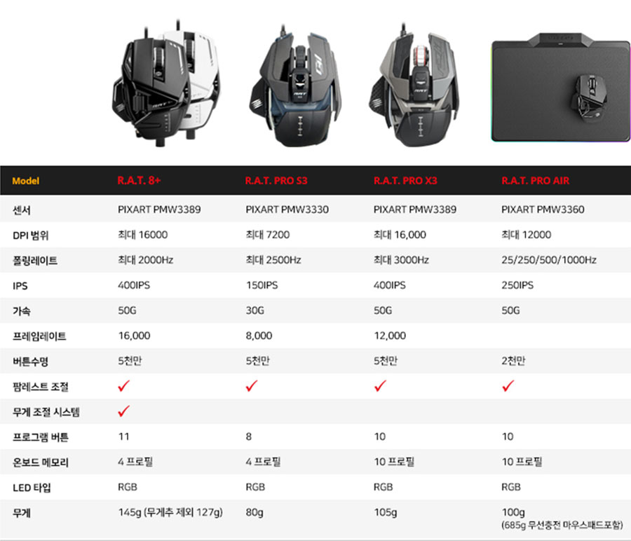 R.A.T 시리즈 중에서 스펙상으로 플러그십 모델이면서 마우스 무게를 커스터마이징이 가능한 제품으로 8 PLUS의 심플 버전으로 보시면 좋을 거 같습니다.