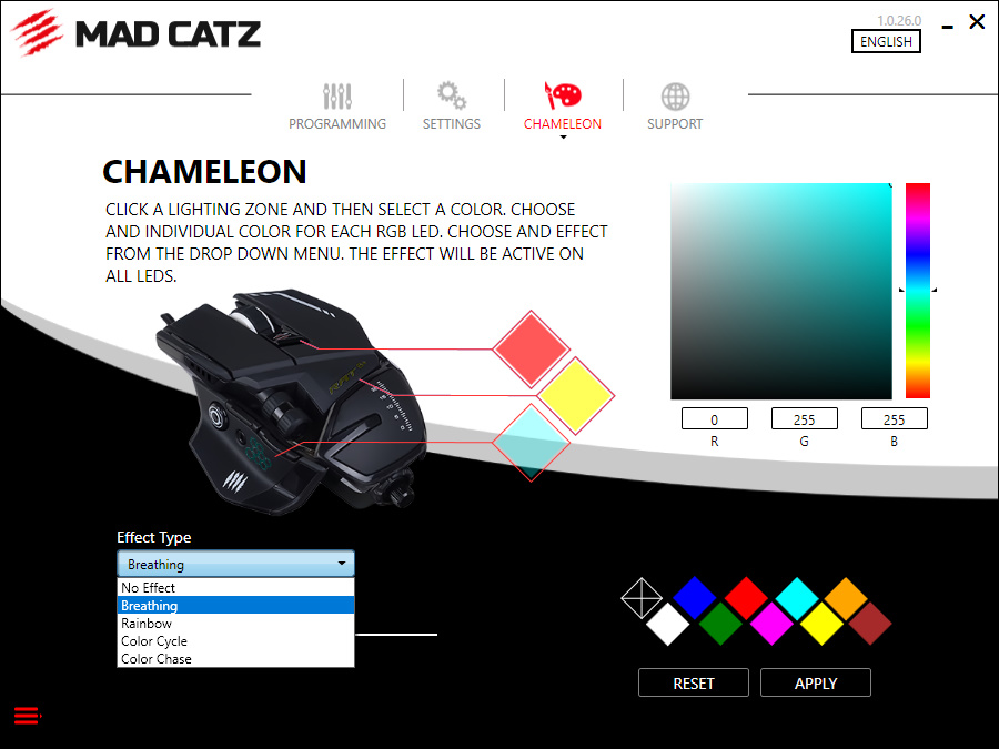 DPI 버튼 / 사이드 패널 / 마우스 상단 로고 3곳의 LED ZONE에 같은 컬러 또는 다른 컬러를 지정하여 LED 사용이 가능하며 LED 설정을 개별로 해도 Rainbow / Color Cycle 설정에서는 Rainbow / Color Cycle 설정의 경우 1680만 컬러로 표현되는 효과에서는 지정된 컬러가 표현되지 않지만, 그 외 설정에서는 지정된 컬러로 표현됩니다.