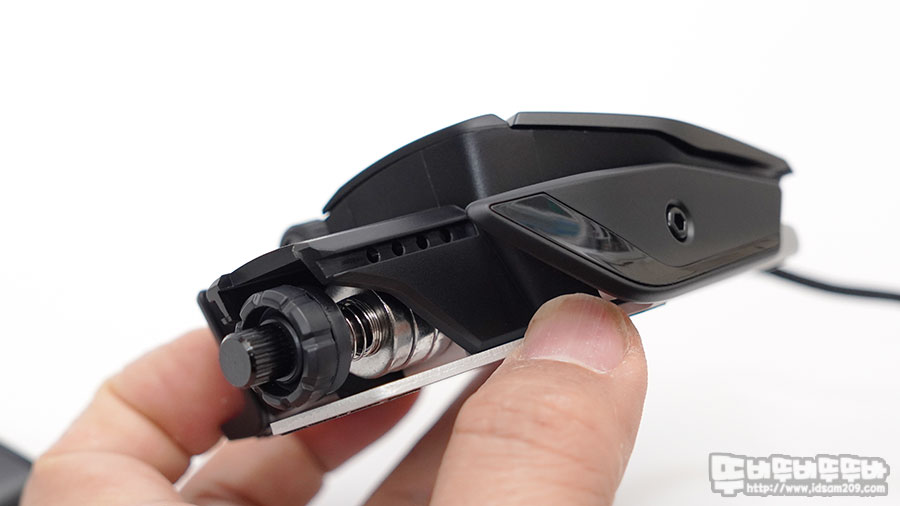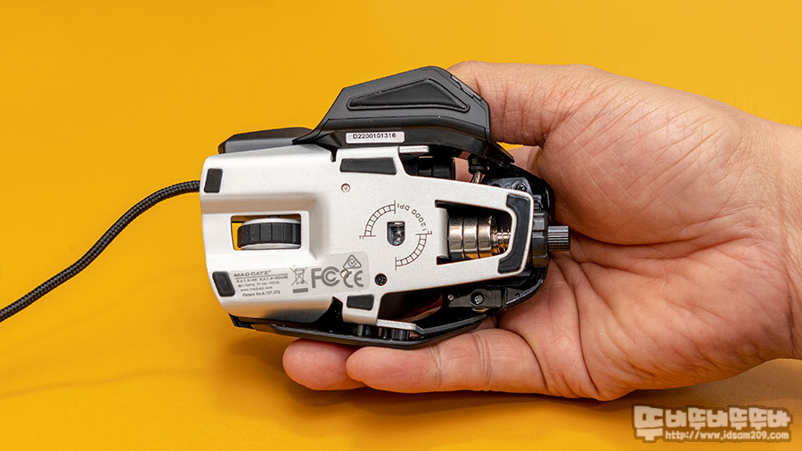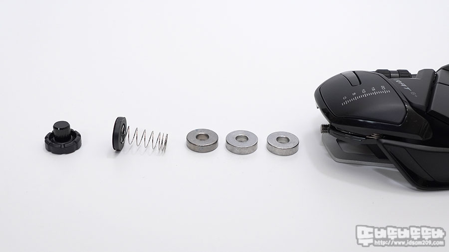 마우스 뒤쪽 부분에 6g 무게 3개가 기본으로 장착되어있어 약 120g의 중량감을 주며 무게추를 모두 제거 시 약 102g의 중량감으로 사양이 가능합니다.