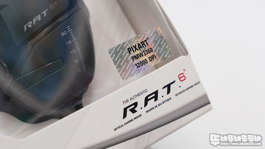 패키지는 투명 플라스틱 소재를 통해 제품의 실물을 직접 확인할 수 있는 디자인으로 패키지 하단에 모델명인 R.A.T 6+와 픽셀아트 PMW 3360 센서 사용에 대한 정보 확인이 가능하고요.