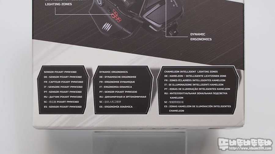 프로그래밍 버튼, 카멜레온 라이팅 존, 길이 조절이 가능한 팜레스트에 대한 설명을 제품 이미지와 같이 또 다국어로 표현하고 있네요.