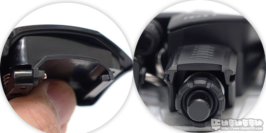 마우스 후면의 팜레스트 아래쪽에 레버를 이용하여 고정핀과 팜레스트 가이드 측면에 4개의 구멍을 이용하여 팜레스트 연장이 가능하여 사용자의 손에 맞는 맞춤형 사이즈로 사용이 가능합니다.
