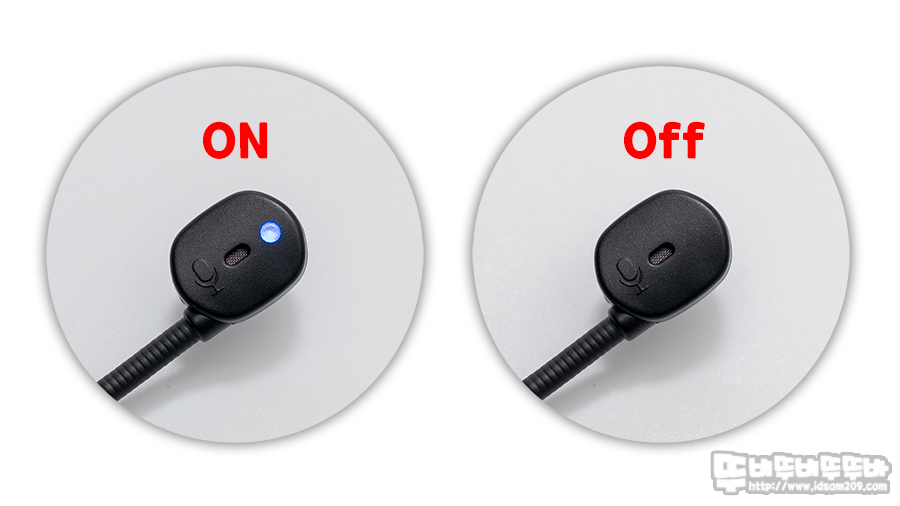 120mm 길이의 탈착형 마이크는 자바라 스틸을 이용하여 고정력이 좋은 움직임을 제공하고 있으며 왼쪽 하우징 표면의 마이크 On/Off 아이콘 부분을 눌러 마이크 제어가 가능합니다.
