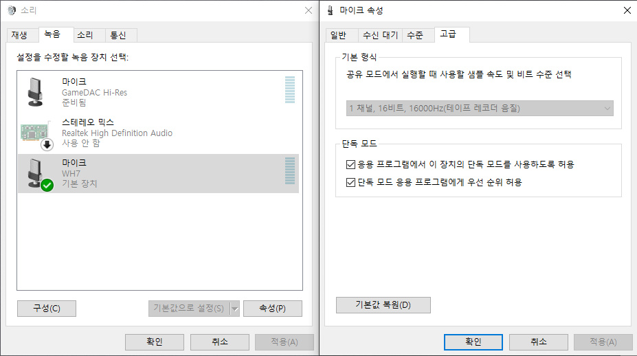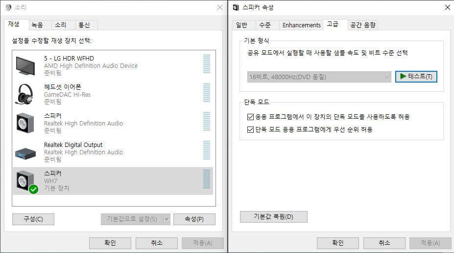 USB 사운드카드 명칭은 WH7로 잡히며 Enhancements 항목에서 베이스 부스트, 가상 서라운드 등 소프트웨어서 제공하는 기능을 사용할 수 있으며 사운드는 16비트 48KHz를 제공하며 마이크 항목에서는 16비트 16KHz 성능을 지원하는 것을 확인할 수 있습니다.