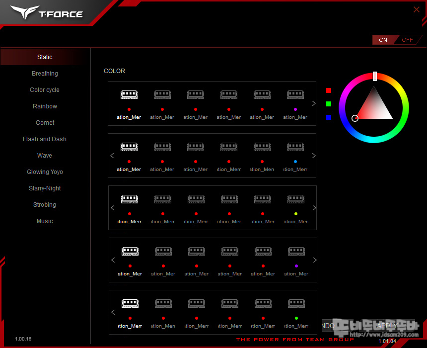위의 사진은 기본 6개의 메모리 모양을 좌/우로 넘기는 형태로 선택하게 되는데 메뉴로 베타 버전이라 그런지 메모리 채널과 메모리별 LED 어드레스를 구분하는 기준점이 없어서 LED 설정 시 인내심이 필요하더군요.