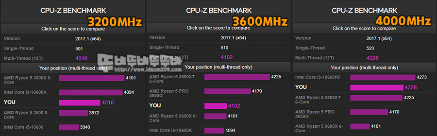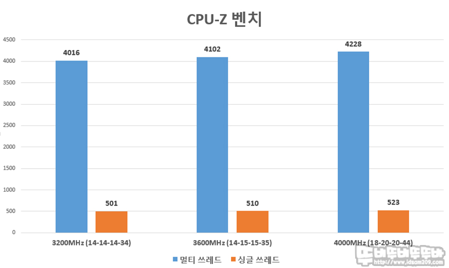 싱글 쓰레드 성능은 3200 MHz에서 3600 MHz 오버 시 1.98%, 3600 MHz에서 4000 MHz 오버 시 1.67%
