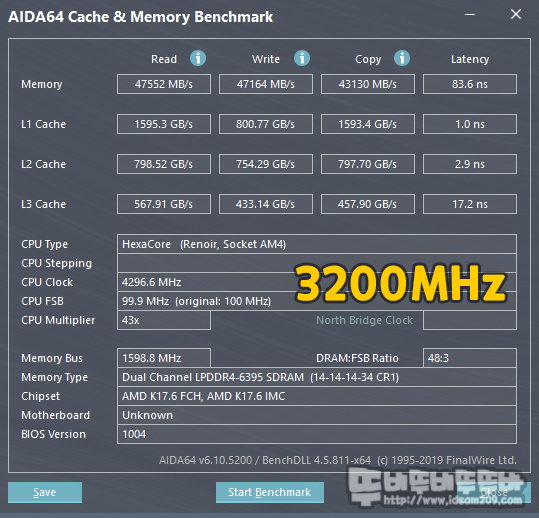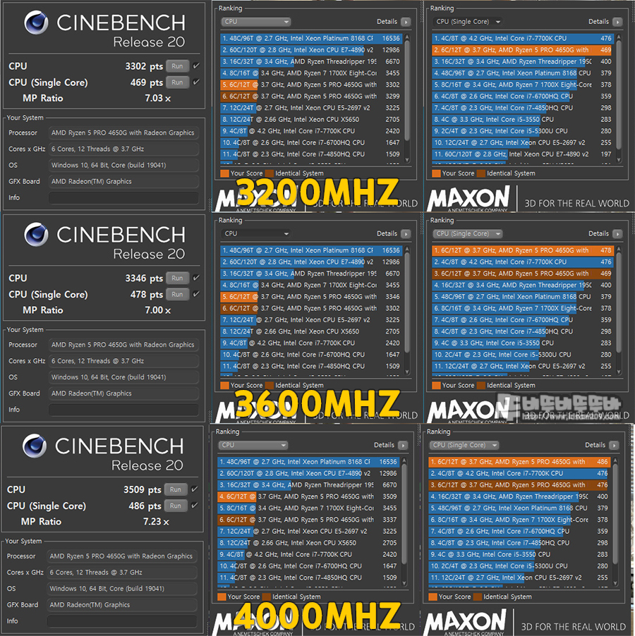 메인보드 C-MOS에 XMP 2.0 적용으로 14-14-14-34 3200 MHz 메모리 클럭으로 설정된 상태에 그리고 추가로 수동 3600, 4000 MHz를 테스트를 병행하여 결과를 살펴보겠습니다.