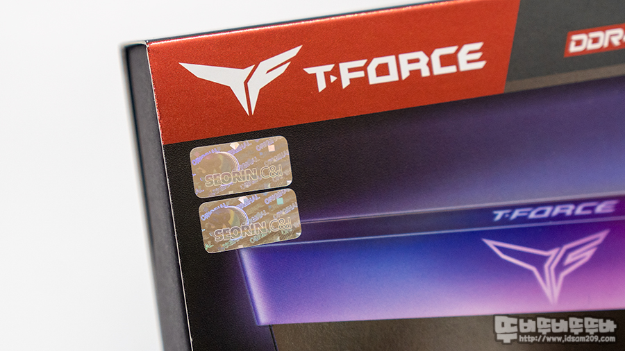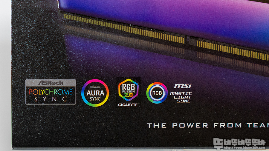 그리고 국내 유통사인 서린 씨앤아이 정품 홀로그램 스티커와 AROCK Polychrome Sync, ASUS Aura Sync, GIGABYTE Funsion RGB 2.0,  MSI Mystic Light Sync 등 메이저 메인보드 회사의 ARGB Sync 지원과 T-Force의 자체 ARGB 프로그램인 BLITZ를 이용한 메모리 단독 ARGB 효과 제어가 가능한 부분을 알리는 로고들이 인쇄되어있네요.