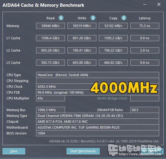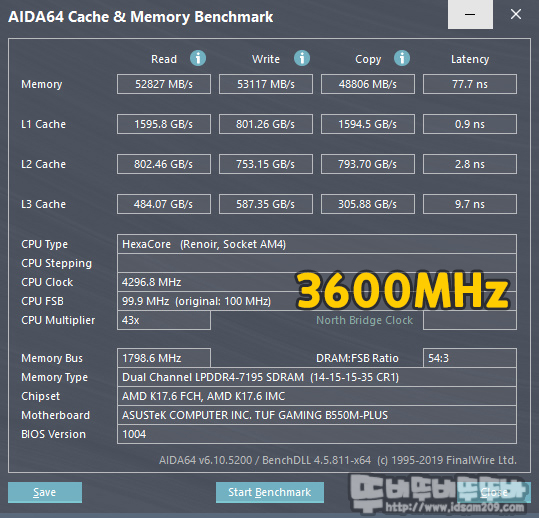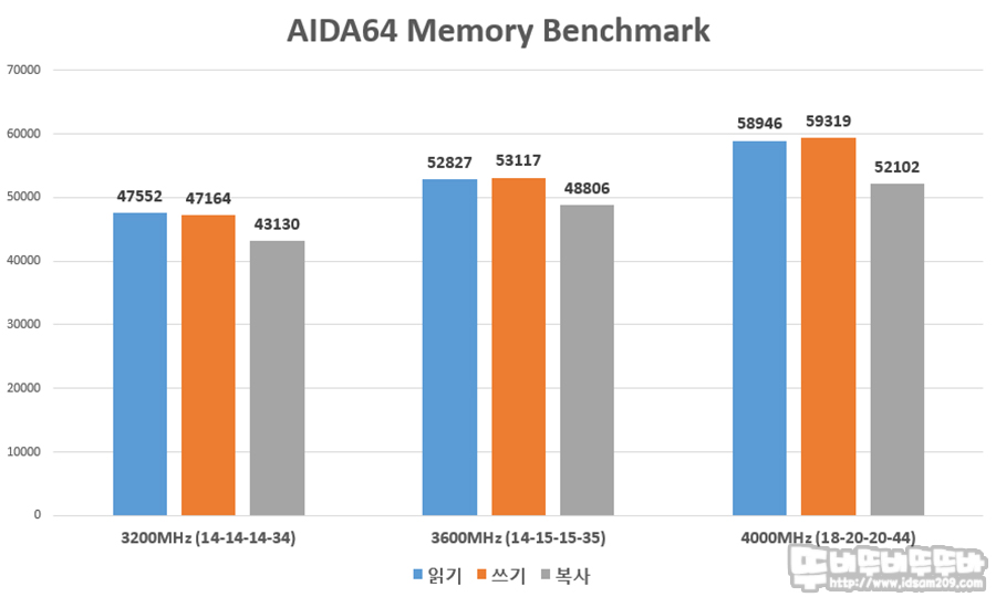 복사 성능은 3200 MHz에서 3600 MHz 오버 시 13.1%, 3600 MHz에서 4000 MHz 오버 시 6.75%