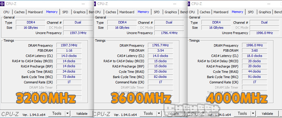 읽기 성능은 3200 MHz에서 3600 MHz 오버 시 11%, 3600 MHz에서 4000 MHz 오버 시 11.5%