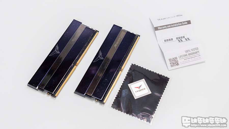제품의 구성으로는 TeamGroup T-Force DDR4-3200 CL14 XTREEM ARGB  메모리 8GB 2개 (16GB), 티포스 로고 스티커 미러 클리닝 극세사 융, 워런티 가이드로 구성되어있습니다.