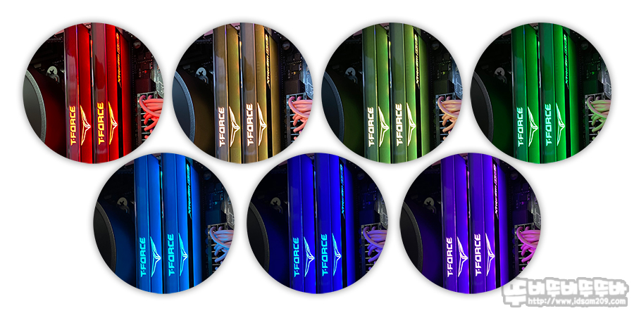 ARGB를 지원하는 제품답게 테스트 보드인 ASUS 메인보드의 AURA Sync를 통해 다양한 LED 설정이 가능한 T-Force XTREEM ARGB 시리즈의 가장 기본이 되는 7가지 컬러를 LED 표현을 사진으로 담아보았습니다.