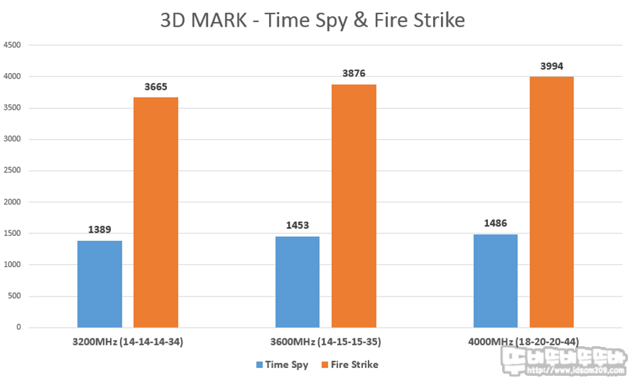 Time Spy 성능은 3200 MHz 기준으로 3600 MHz 오버 시 4.60% 4000 MHz 오버 시 2.27%