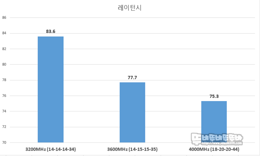 레이턴시의 경우 3200 MHz에서 3600 MHz 오버 시 -7.59%, 3600 MHz에서 4000 MHz 오버 시 3.18%의 향상을 확인할 수 있었습니다.