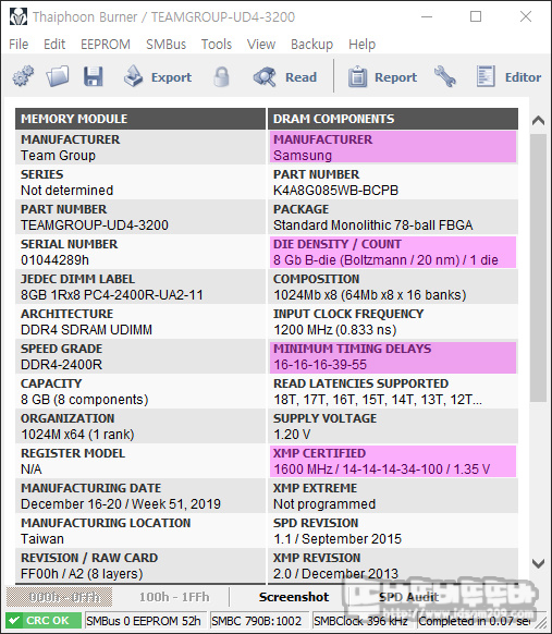 먼저 타이푼 버너를 통한 메모리 구성을 확인해보면 삼성의 B다이가 사용된 기본 램 타이밍 16-16-16-39 제품으로 XMP 프로파일이 적용되어있어 14-14-14-34 3200 MHz로 사용이 가능하네요.