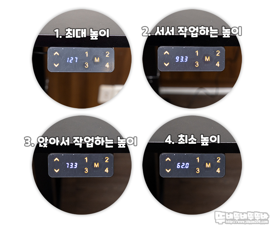 1. 최대 높이인 127mm / 2. 평균 신장의 성인이 서서 작업 시 적당한 높이 93.3mm / 3. 평균적인 책상 높이 73.3mm / 4. 최소 높이 62.0mm