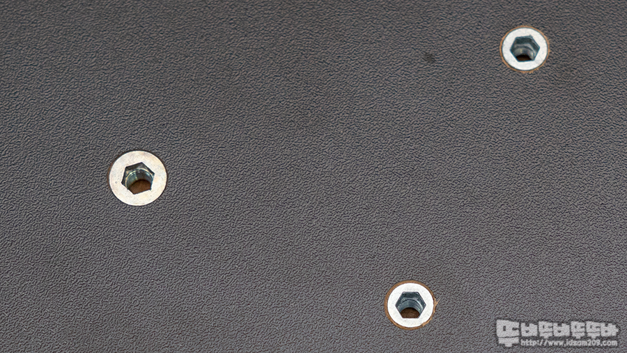 상판 바닥면에는 전동 다리와 프레임 등을 연결할 수 있는 스크류 홀이 있는데요.