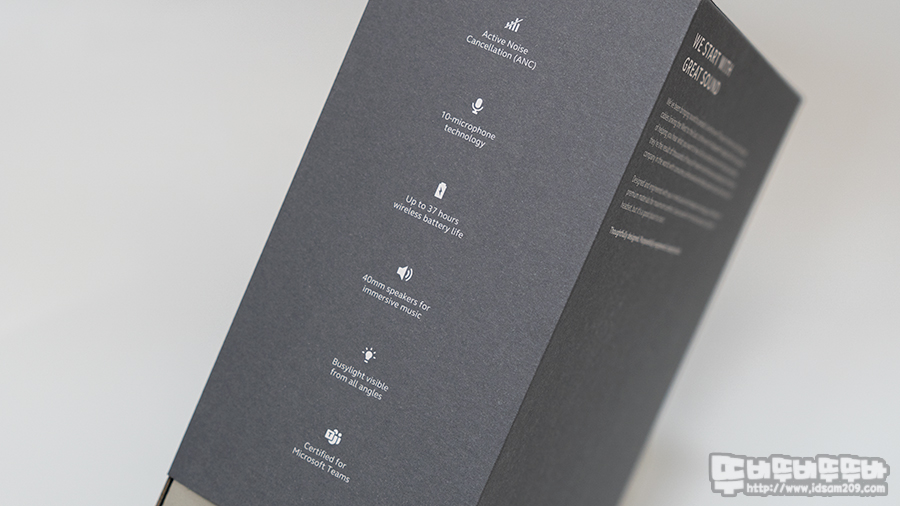 박스에 커버 형태로 씌워진 부분에는 제품의 모델명인 EVOLVE2 85와 액티브 노이즈 캔슬링 ANC, 10개의 마이크 적용, 무선 37시간 사용을 강조하고 있으며 커버 측면에도 반복되는 내용과 40mm 드라이버 유닛, 바쁨 표시 라이팅, Microsoftt Teams 인증에 대한 내용이 아이콘으로 표기되어있습니다.