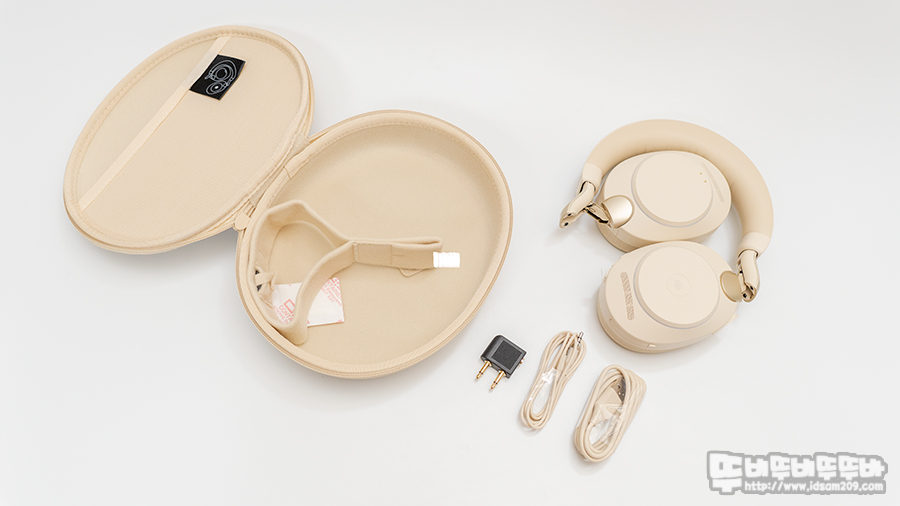 제품의 구성은 충전 스탠드, AUX 케이블, 충전용 USB Type C 케이블, 헤드셋 본체, 항공기용 변환 아답터, 파우치로 구성되어있습니다.