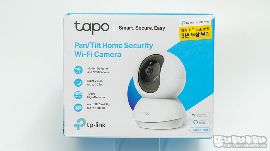 TP-LINK Tapo C200 Wi-Fi 스마트 카메라 패키지에서는 업계 최고 수준 보장 3년 무상 보증 스티커가 눈에 띄는데요.