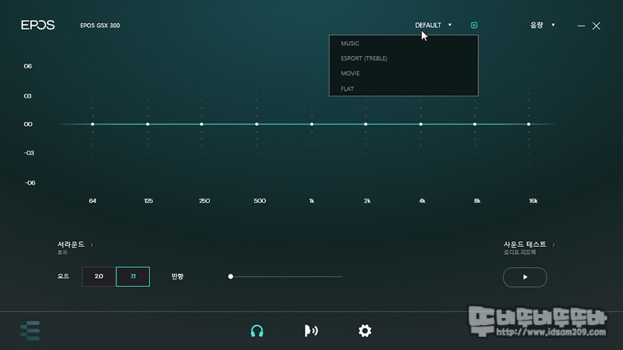 이렇게 기본 2.0 채널의 사운드와 가상 7.1 채널 구분과 EQ의 변경으로 다양한 사운드를 들려주는 프리셋은 기본값으로 사용하거나 취향에 따라 변경하여 사용이 가능하니 참고하시고요.