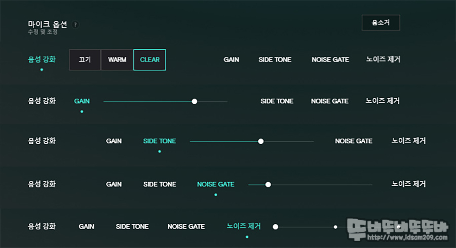 마이크 설정 기능에서는 음색 Warm, Clear 선택, 민감도를 설정할 수 있는 Gain 기능, 목소리를 모니터링할 수 있는 사이드톤, 노이즈 게이트와 노이즈 제거 기능 등 보통의 사운드카드에서 지원하지 않는 보이스 채팅에서 중요한 섬세한 기능을 제공하고 있습니다.