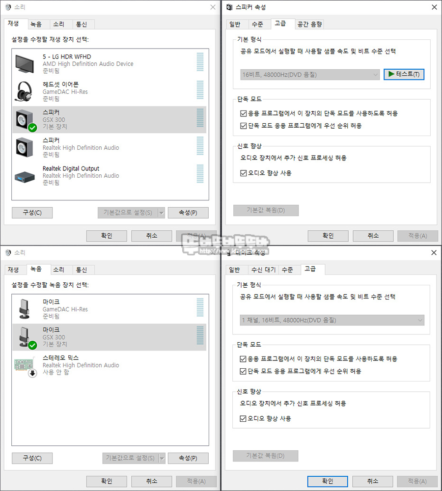 컴퓨터에서 GSX 300 연결 시 헤드폰으로 인식이 되며 16/24비트 48,000Hz, 24비트 96,000Hz의 사운드와 16비트 48,000Hz 마이크의 비트레이트 지원을 확인할 수 있으며