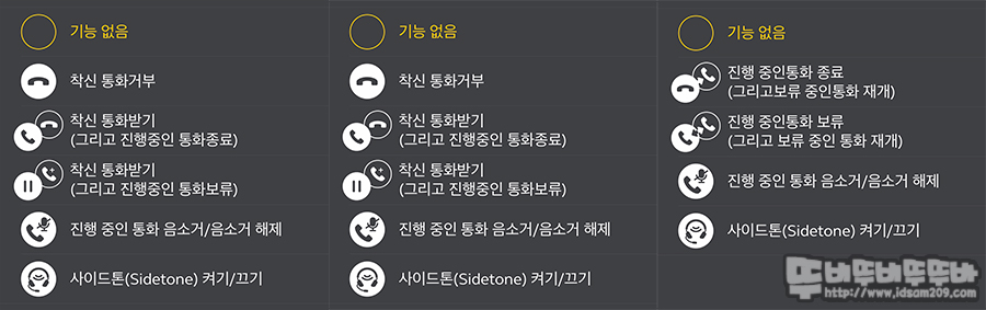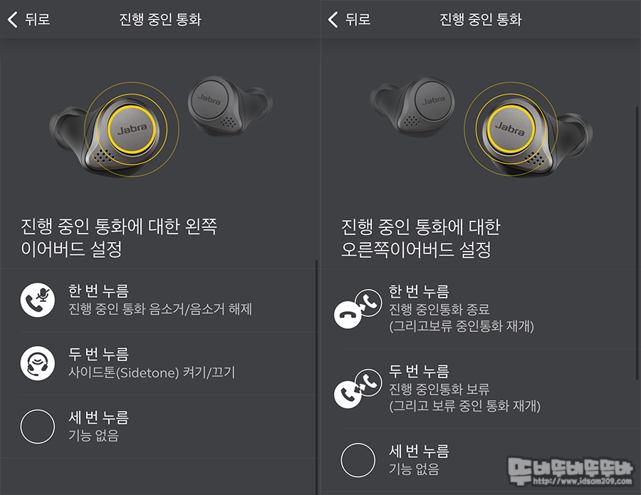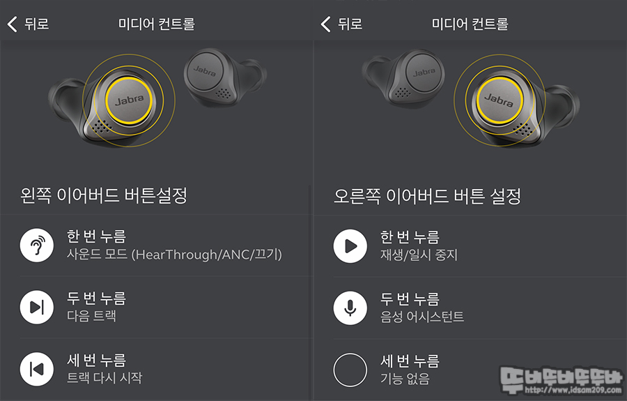 MyControls 메뉴에서는 미디어 재생할 때 / 전화받을 때 / 전화를 걸을 때 이어버드의 왼쪽/오른쪽에 기본으로 저장된 컨트롤 기능을 커스터 마이징을 할 수 있게 지원해줍니다.