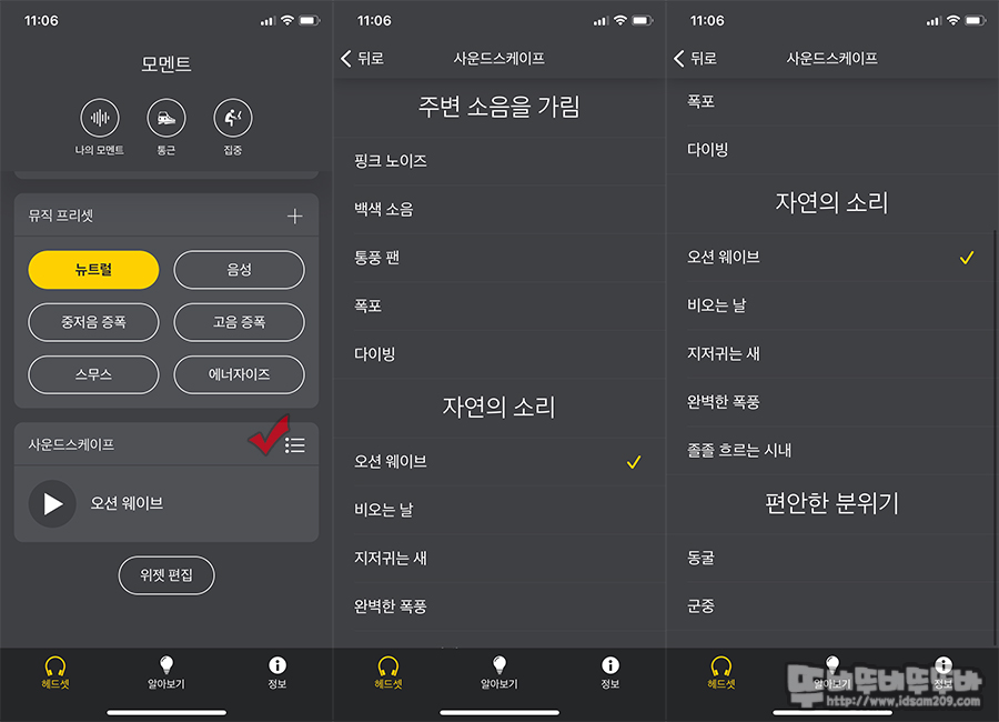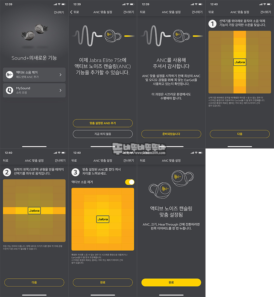먼저 액티브 노이즈 캔슬링 최적화 기능은 시끄러운 공간에서 테스트 시 노이즈 캔슬링 따른 반응을 빠르게 확인이 가능하며 가로 선택으로 노이즈 캔슬링 강도를 세로 형태 좌우 밸런스 선택으로 사용자에 최적화된 노이즈 캔슬링 기능을 사용할 수 있습니다.