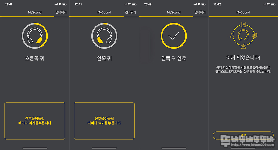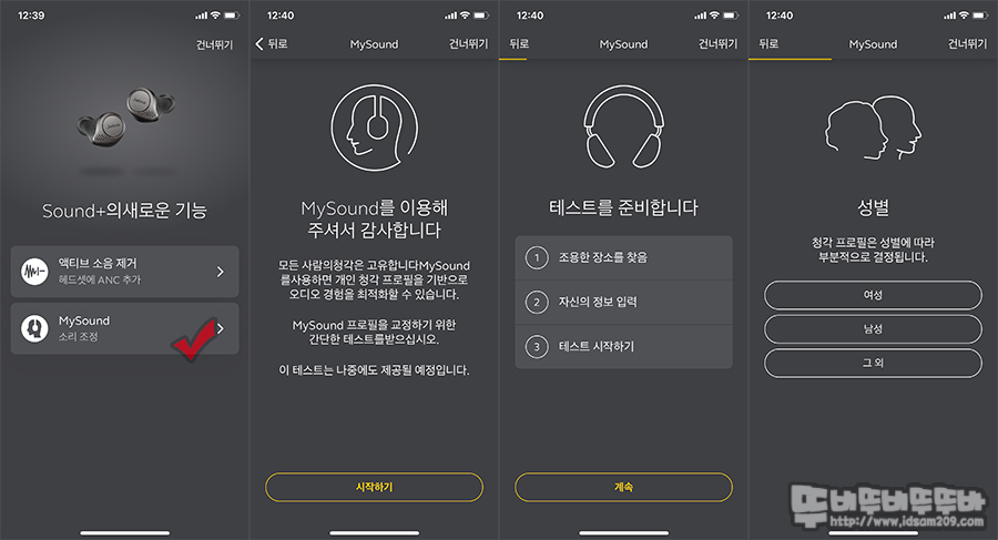 청력은 나이와 반비례하기에 세팅 시작 전 출생 연도를 선택을 시작으로 다양한 주파수 대역의 소리를 왼쪽과 오른쪽 개별 테스트로 설정을 이어 나가며 미세한 소리를 들어야 하기에 주변 소음이 없는 조용한 공간에서 진행하시기 바랍니다.