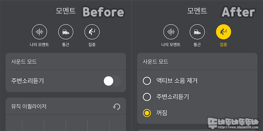 이전에는 주변소리를 듣기(히어 쓰루)만 지원했던 사운드 모드에 액티브 노이즈 캔슬링 기능이 추가됨을 확인할 수 있는데요.